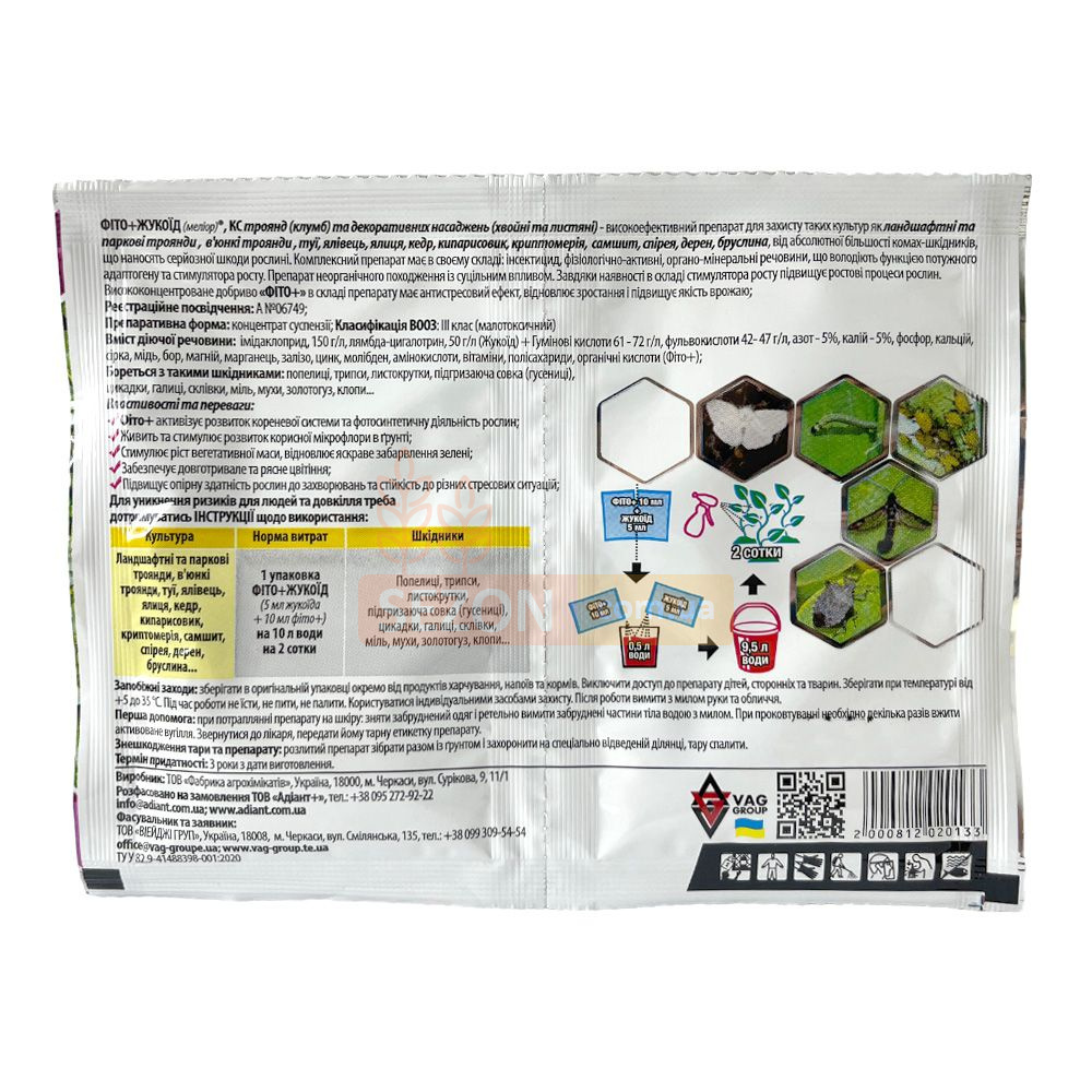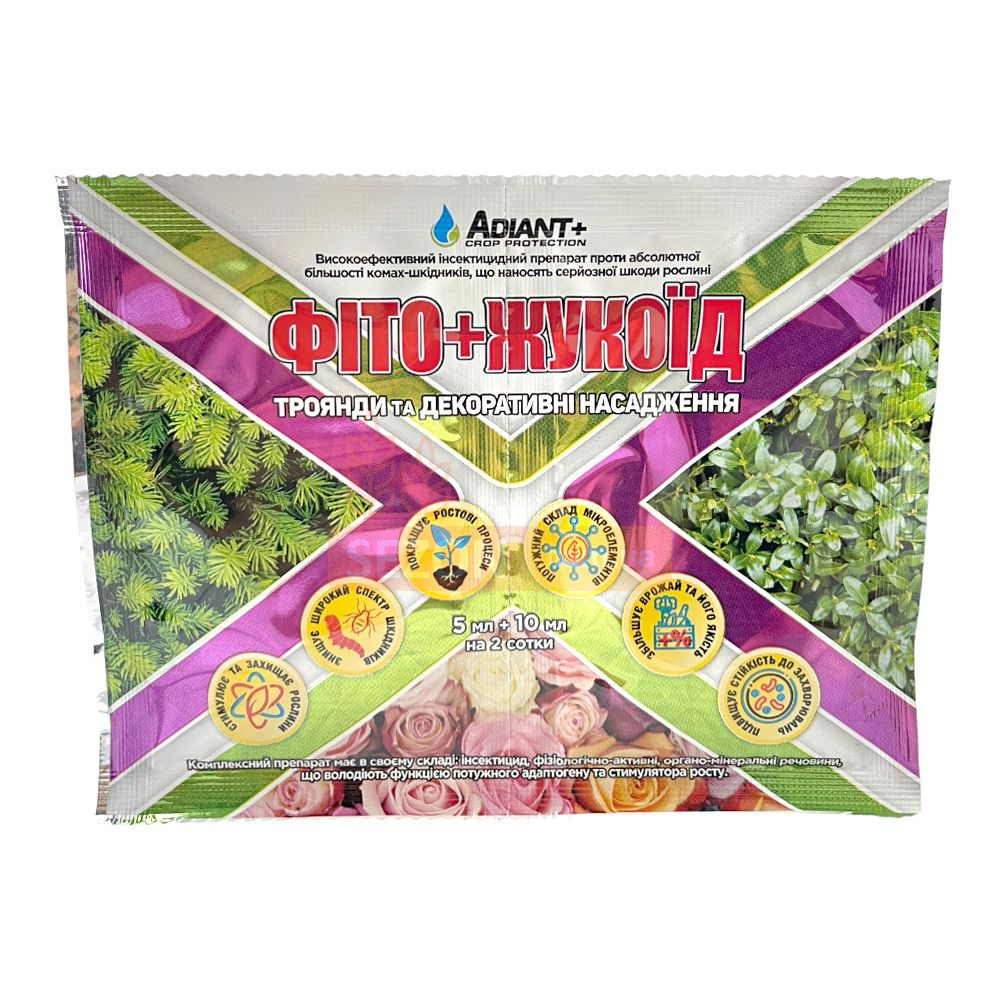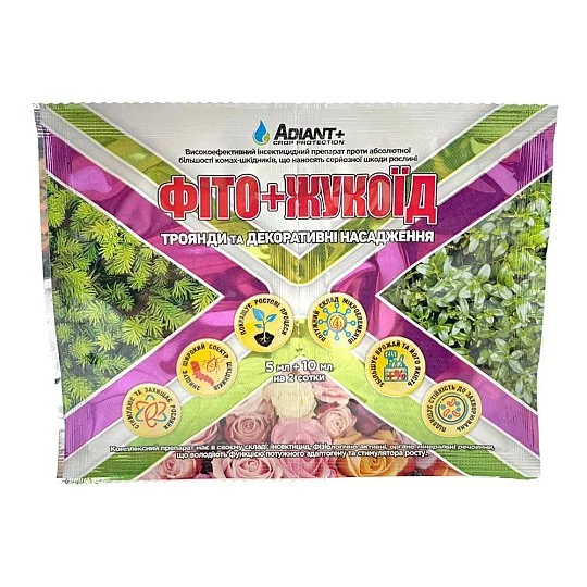 Ландшафтні та паркові троянди, кучеряві троянди, туя, ялівець, ялиця, кедр, кипарисовик, криптомерія, самшит, спірея, дерн, бруса | 1 упаковка фіто+ жукоєд (5 мл жукоєда + 10 мл фіто+) на 10 л води на 2 сотки | Попелиця, трипс, листовійка, совка, цикадка, галиця, склянка, моль, златогузка, мухи, мошки, клопи, листогризні гусениці |