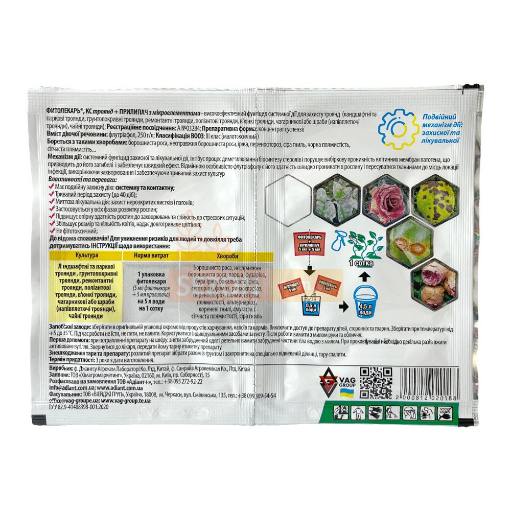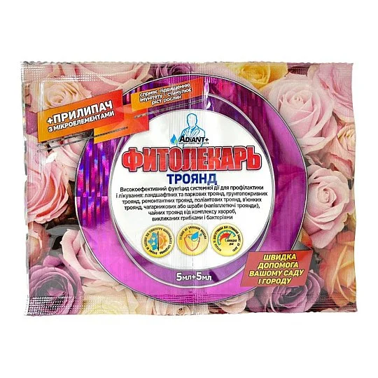 Ландшафтні та паркові троянди, грунтоукривні троянди, ремонтантні троянди, поліантові троянди, чайні троянди | 1 спарена упаковка на 5 л води на 1 сотку | Мучниста роса, несправжня борошниста роса, парша, фузаріоз, бура іржа, бокальчаста іржа, септоріоз, фомоз, ринхосопріоз, різновиди гнилей, плямиста іржа, коренева гниль, сіра гниль, смугаста і сітчаста |