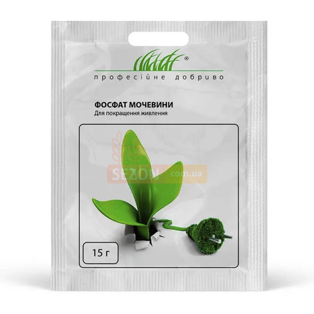 Фосфат сечовини – це концентроване азотно-фосфатне добриво для підживлення всіх видів рослин. Препарат прискорює розвиток кореневої системи рослини, збільшує кількісні та якісні показники врожаю, підвищує абсорбцію поживних речовин із ґрунту. Хімічний склад: 18% азоту та 44% фосфору. Метод застосування: обприскування або кореневе підживлення. Норма витрати: 15 г на 10 л води на 100-150 кв. при позакореневому підживленні або 50-100 кв.м при кореневому.