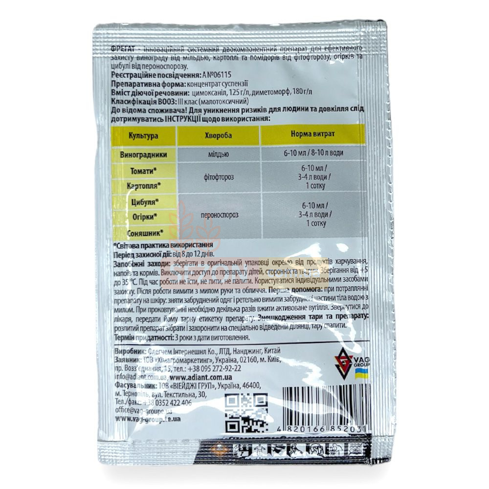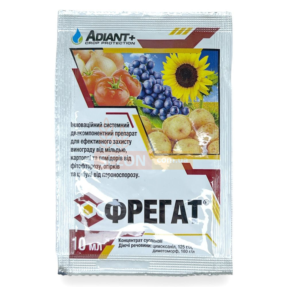 Фрегат - системний двокомпонентний препарат для ефективного захисту винограду від мілдью, картоплі та томатів від фітофторозу, огірків та цибулі від пероноспорозу.