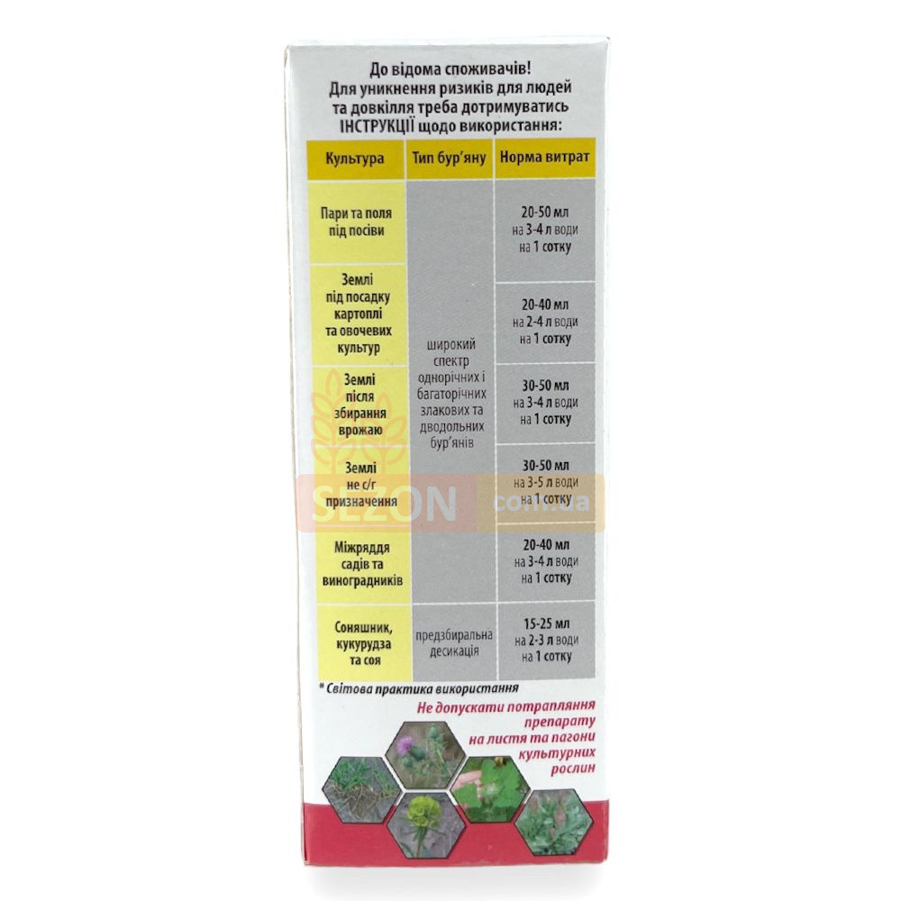 Землі після збирання врожаю | Широкий спектр однорічних та багаторічних злакових та дводольних бур'янів | 30-50 мл на 3-4 л води на 1 сотку |