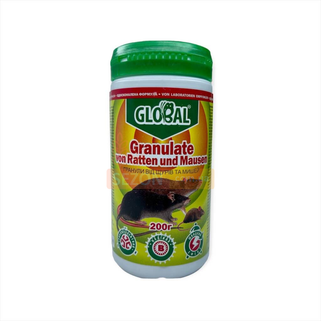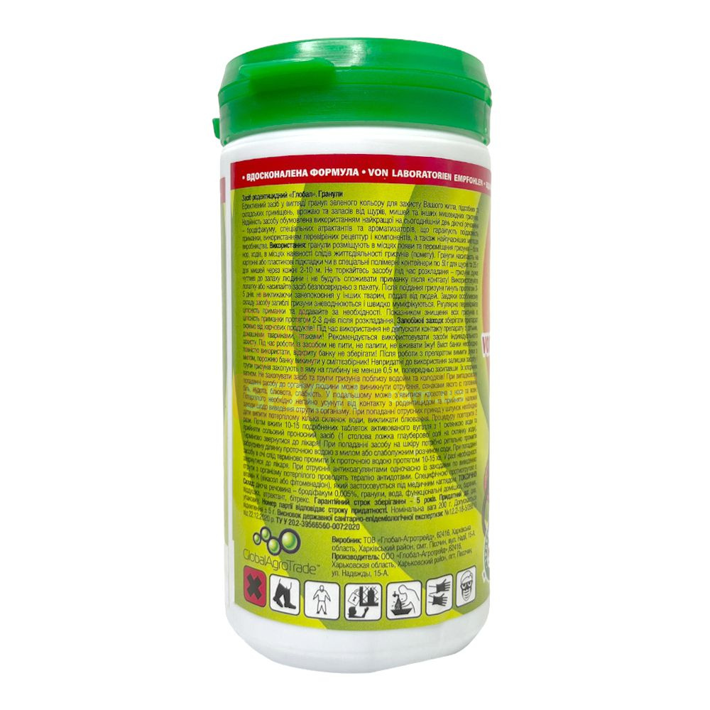Гранульований родентицидний препарат Global від GlobalAgroTrade Україна, призначений для боротьби з щурами та мишами. Цей ефективний препарат застосовується для захисту житлових, промислових, підсобних і складських приміщень, а також у сховищах, на дачних і садових ділянках, у сараях, підвалах для знищення мишоподібних гризунів, включаючи щурів, мишей, полівок. Принада містить активний компонент – бродіфакум, родентицид кишкової дії, який є синтетичним антикоагулянтом. Ця речовина порушує процес формування білків протромбінового комплексу. Через добу після споживання смертельної дози препарату згортання крові значно зменшується, що призводить до внутрішньої кровотечі та подальшої загибелі паразита. Загиблі гризуни зазвичай муміфікуються через зневоднення, спричинене препаратом. Продукт містить ароматизовані харчові добавки, які слугують принадою для гризунів.