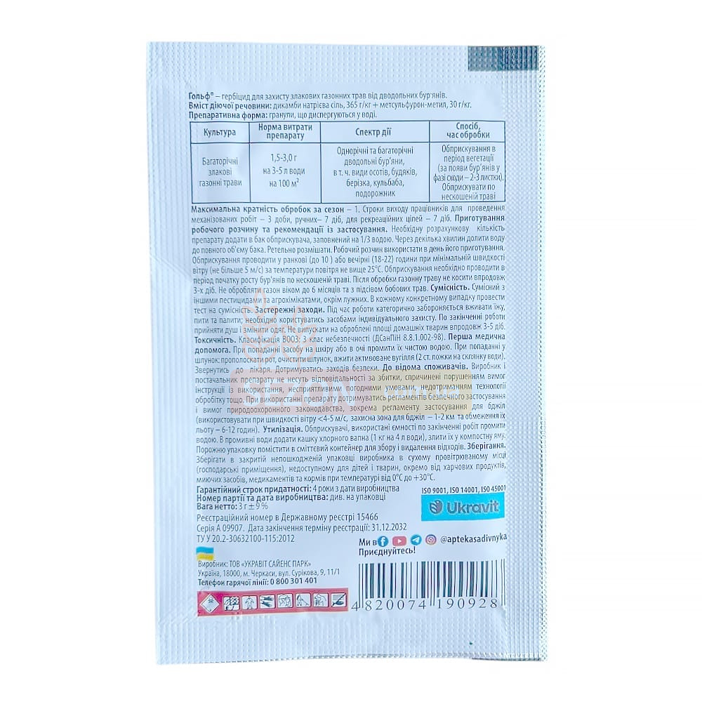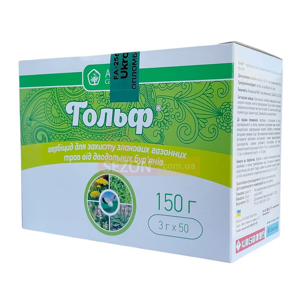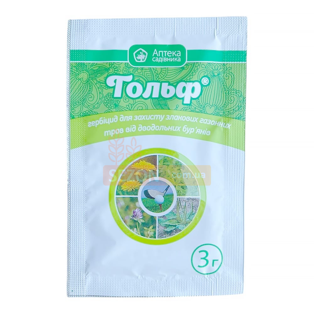 Гольф – це двокомпонентний гербіцид вибіркової дії, призначений для знищення однорічних і багаторічних бур’янів на газонах, спортивних майданчиках, парках і злакових травах.