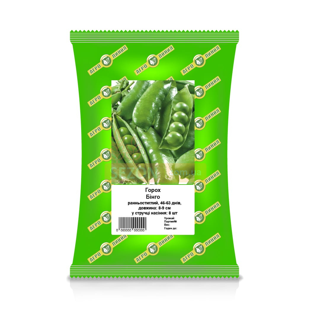 Горох овочевий Бінго — пізньостиглий сорт із великими, соковитими зернами та високою стійкістю до несприятливих умов. Відрізняється чудовим смаком, доброю лежкістю та здатністю давати стабільний урожай навіть у посушливі роки. Підходить для споживання у свіжому вигляді, переробки та заморожування.