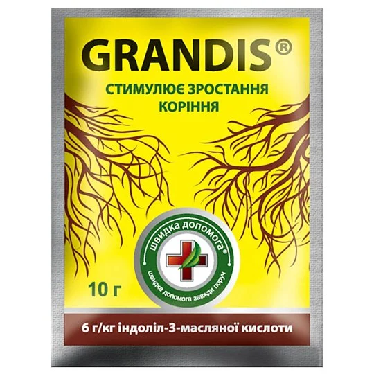 Grandis® – інноваційний засіб для швидкого вкорінення живців, розсади та насіння. Препарат містить індоліл-3-масляну кислоту, яка активізує утворення кореневих клітин і сприяє формуванню потужної кореневої системи. Використовується для обробки плодових, декоративних та ягідних культур, забезпечуючи їх швидке приживлення після посадки. Підходить для застосування в теплицях, садах та домашніх умовах.