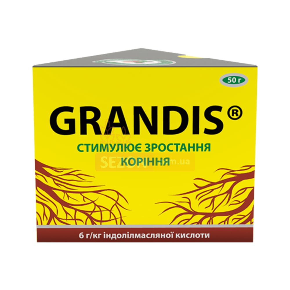 Grandis® – інноваційний засіб для швидкого вкорінення живців, розсади та насіння. Препарат містить індоліл-3-масляну кислоту, яка активізує утворення кореневих клітин і сприяє формуванню потужної кореневої системи. Використовується для обробки плодових, декоративних та ягідних культур, забезпечуючи їх швидке приживлення після посадки. Підходить для застосування в теплицях, садах та домашніх умовах.