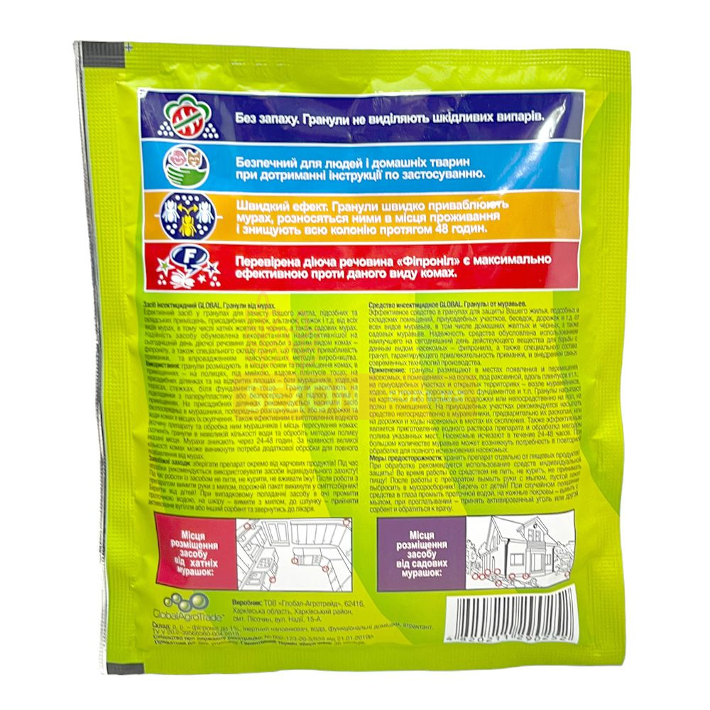 Гранульований препарат Global швидко знищує всіх видів мурах – хатніх, садових, чорних і жовтих. Активний компонент фіпроніл викликає нервовий параліч у комах, забезпечуючи повне знищення колонії протягом 24-48 годин. Завдяки розповсюдженню гранул мурахами всередині гнізда, засіб гарантує тривалий захист обробленої території.