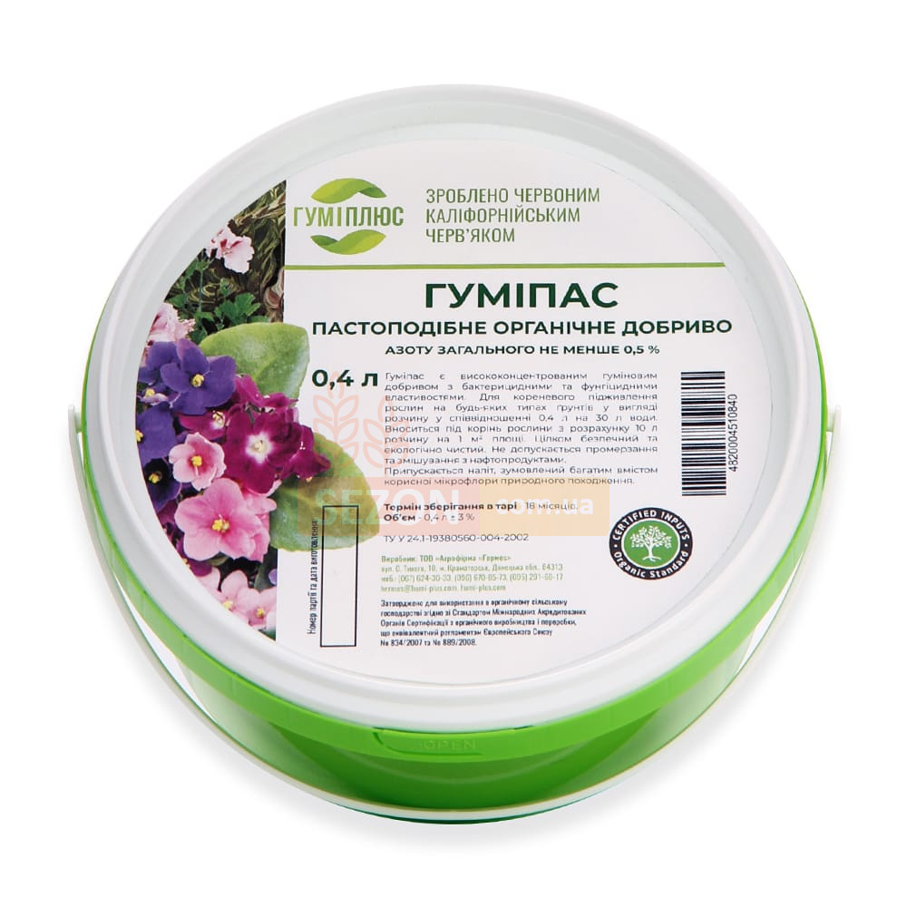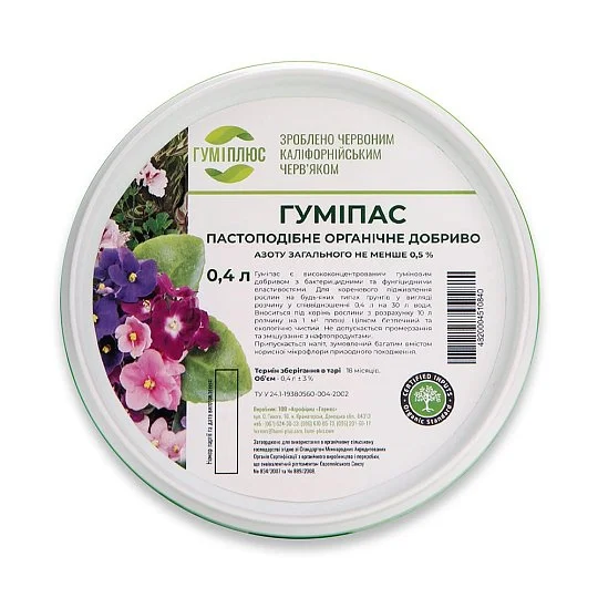 Гуміпас — це пастоподібне висококонцентроване гумінове добриво, що поєднує властивості стимулятора росту, природного фунгіциду та бактерицидного засобу. Завдяки багатому складу та високій біологічній активності воно забезпечує комплексне живлення й захист рослин, покращує структуру ґрунту та сприяє отриманню екологічно чистої продукції.