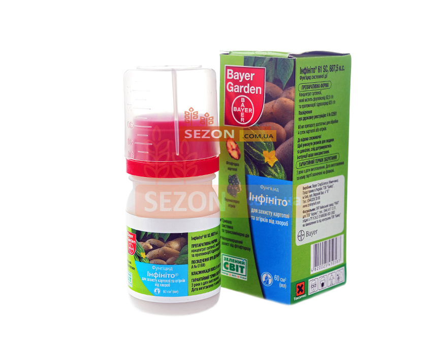 Інфініто – високоефективний двокомпонентний фунгіцид системної дії. Препарат відмінно захищає картоплю та овочеві культури (огірки, томати, капуста) від фітофторозу, пероноспорозу, хибної борошнистої роси. Використовується як профілактики захворювань, так лікування. Фунгіцид ефективний тривалий період. Стійкий для змивання атмосферними опадами. Флуопіколід, пропомокарб гідрохлорид. Препаративна форма: концентрат суспензії. Термін очікування: для картоплі, огірків – 10 днів, для капусти – 14 днів.