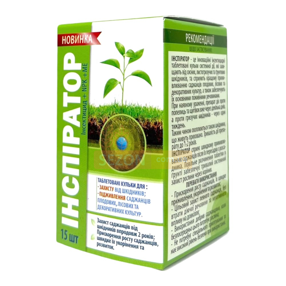 «Інспіратор» – це не лише інсектицид, а й добриво! До складу входять азот, фосфор, сірка, цинк, залізо, бор і марганець, які сприяють швидкому укоріненню саджанців та підвищенню врожайності.