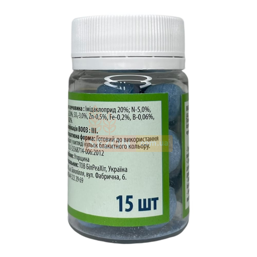 Таблетована форма зручна у використанні: таблетка інсектициду розміщується в кореневій зоні, де поступово розчиняється, забезпечуючи тривалий захист рослин від шкідників. Завдяки діючій речовині – імідаклоприду, засіб ефективно блокує нервову систему комах, запобігаючи їх розмноженню та подальшому пошкодженню культур.