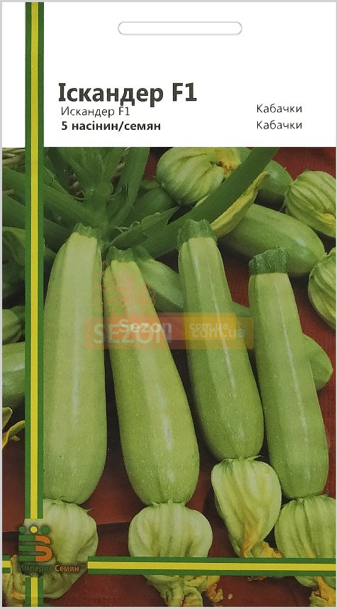 Іскандер F1 – ранньостиглий гібрид. Зав'язує плоди навіть за знижених температур. Болюкостійкий. Вирощують у відкритий спосіб. Насіння висівають у легкі ґрунти на глибину 4-6 см наприкінці березня – на початку квітня. Схема сівби 150-70 см. Період від сходу до технічної зрілості складає всього 40-45 днів. Кабачки мають циліндричну форму. Кора досить тонка. Довжина плодів 18-20 см. Середня вага досягає 550 грам. М'якуш ніжний, смачний, соковитий, не містить гіркоти. Чудовий товарний вигляд. Зберігається протягом тривалого часу. Смак чудовий. Використовують для приготування різних блюд, можна консервувати. Спокійно переносить транспортування великі відстані.