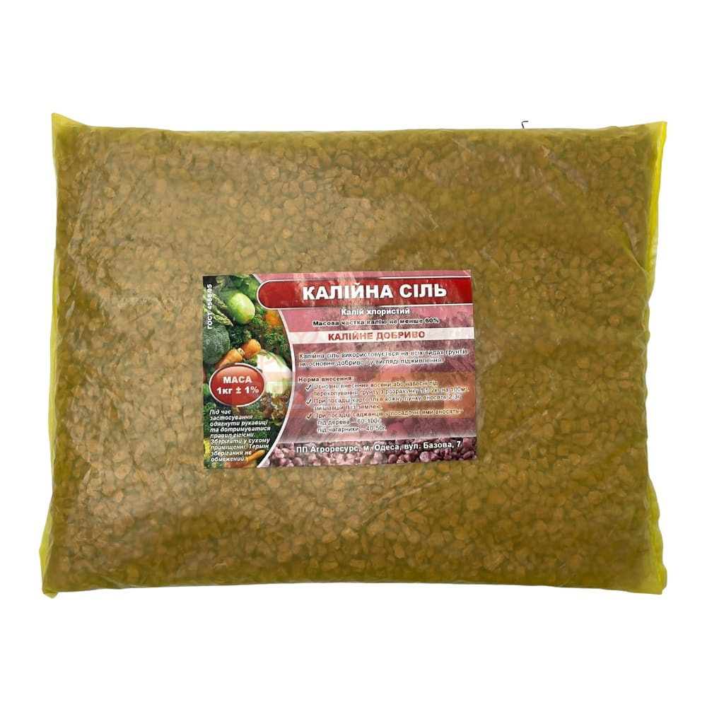 Калійна сіль — це мінеральне добриво, що містить хлористий калій з високим вмістом калію (не менше 60%). Продукт «Волшебная грядка» (Україна) випускається у фасуванні по 1 кг і застосовується для підживлення плодових, ягідних та овочевих культур. Відрізняється високою розчинністю, безпечний для рослин і довкілля.