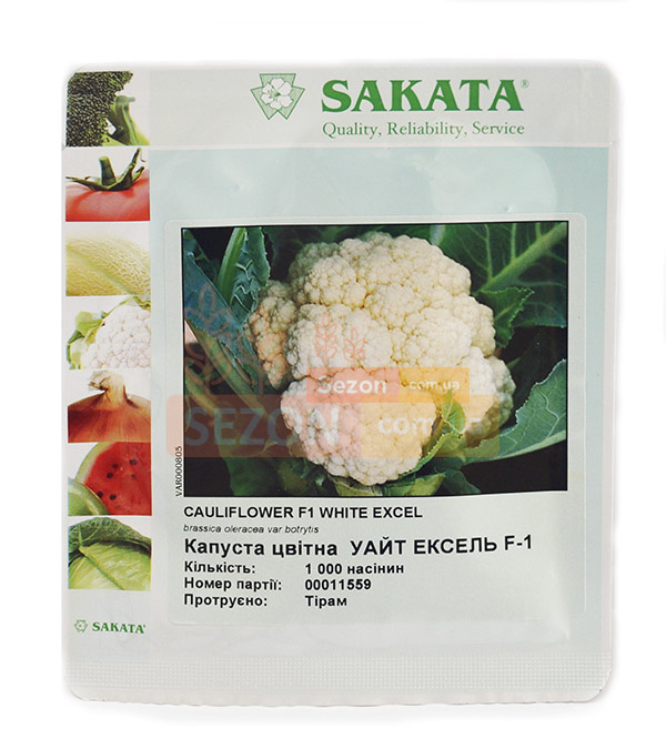 Високоурожайний гібрид цвітної капусти. Період дозрівання – до 70 днів. Уайт Ексел характеризується компактними плодами, які не псуються в умовах підвищеної вологості. Качан щільний, надійно прикритий зеленим листям. Колір плода – білий, форма округла, вага близько 2,5-3 кг. Дозрівання дружне. Такий тип капусти вирощують як у відкритому, так і захищеному грунті, у тому числі в другому обороті. Уайт Ексел високостійкий до фузаріозу. Завдяки чудовим характеристикам та чудовому зовнішньому вигляду цвітна капуста ідеально підходить для свіжого ринку, чудово зберігає товарний вигляд, навіть при тривалому зберіганні.