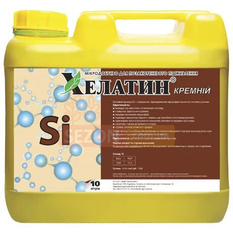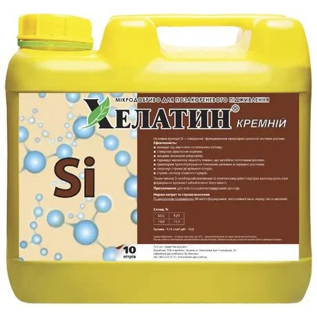 Мікродобрива для позакореневого підживлення. Основна функція Хелатіна Кремнія – створення та функціонування природної захисної системи рослин. Кремній, при попаданні на лист, утворює невидиму плівку, яка запобігає сонячним опікам.