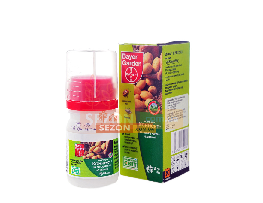 Коннект – інсектицид контактно-системної дії. У складі припарату дві високоефективні діючі речовини: імідаклоприд та бета-цифлутрин. Застосовується для захисту картоплі та овочів від колорадського жука, трипси, довгоносика, щитоноски, попелиці та інших шкідників. Обробку проводити не більше 2 разів та не пізніше 30 днів до збирання врожаю.