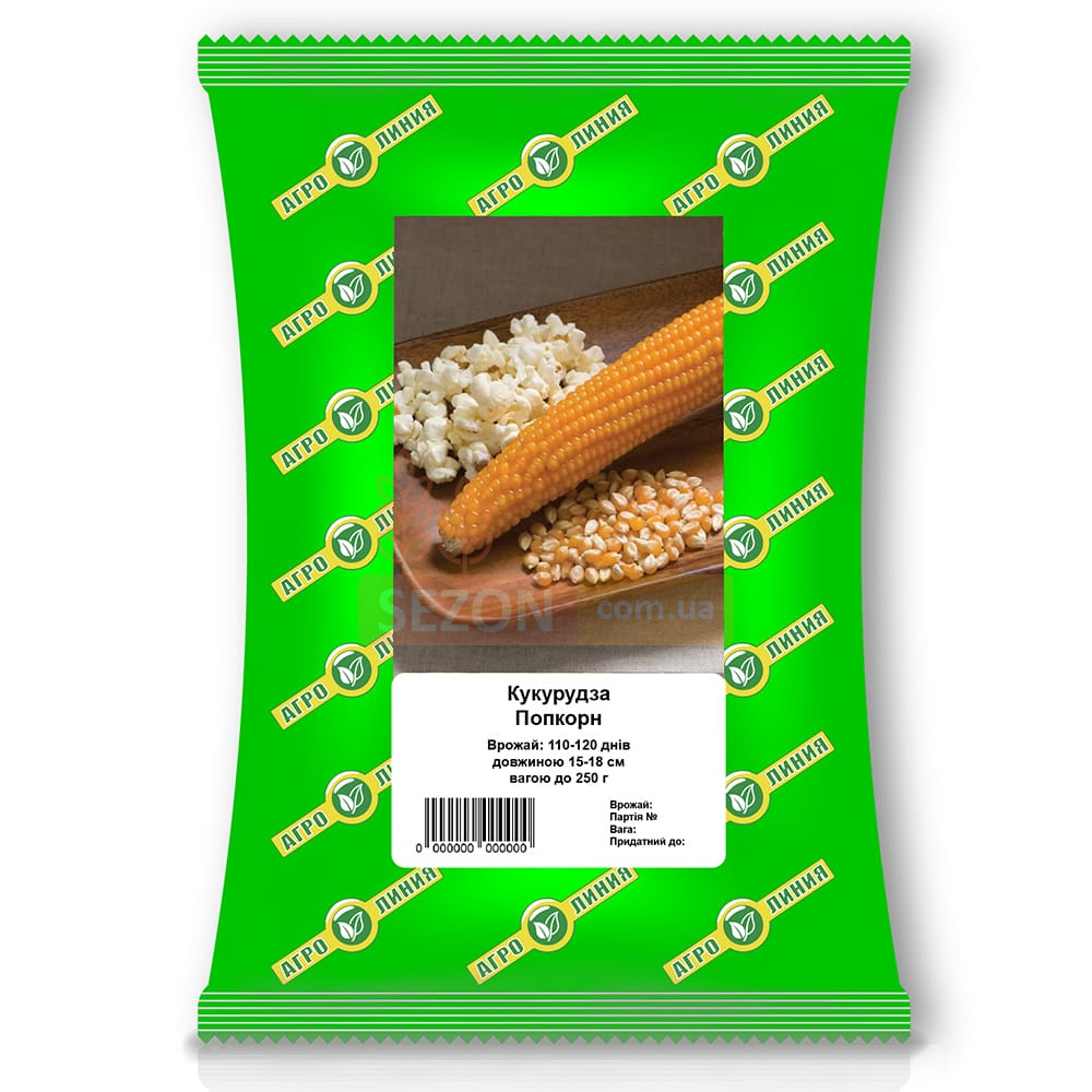 Кукурудза Попкорн – це середньостиглий сорт, який досягає стадії зрілості за 110-120 днів. Рослина виростає до 140-170 см у висоту та не потребує особливого догляду, що робить її зручною для вирощування на дачній ділянці або в городі. Вона формує компактні качани довжиною 15-18 см та масою до 250 г кожен. Зерно має насичений жовтий колір, злегка видовжену форму та загострений кінець. Завдяки склоподібній текстурі та блиску, зерна цього сорту багаті білком (до 16%), що робить їх чудовим вибором для приготування смачного та ароматного попкорну.