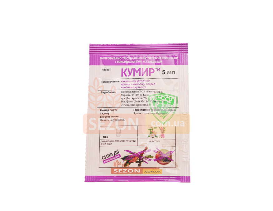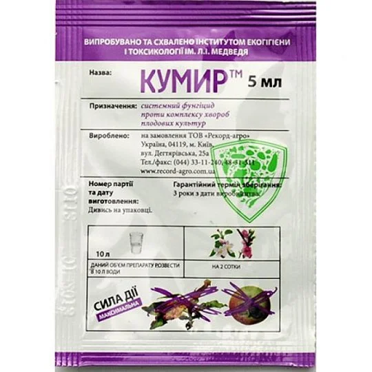 Кумир – системний двокомпонентний фунгіцид. Має профілактичну та лікувальну дії. Використовується від парші, плямистості та кучерявості листя, борошнистої роси. Спосіб внесення: обприскування. Опади, що випали через 2 години, не знижують активність фунгіциду Кумир. Діюча речовина: крезоксим, дифеноконазол. Кратність обробок: 2-4 за сезон.
