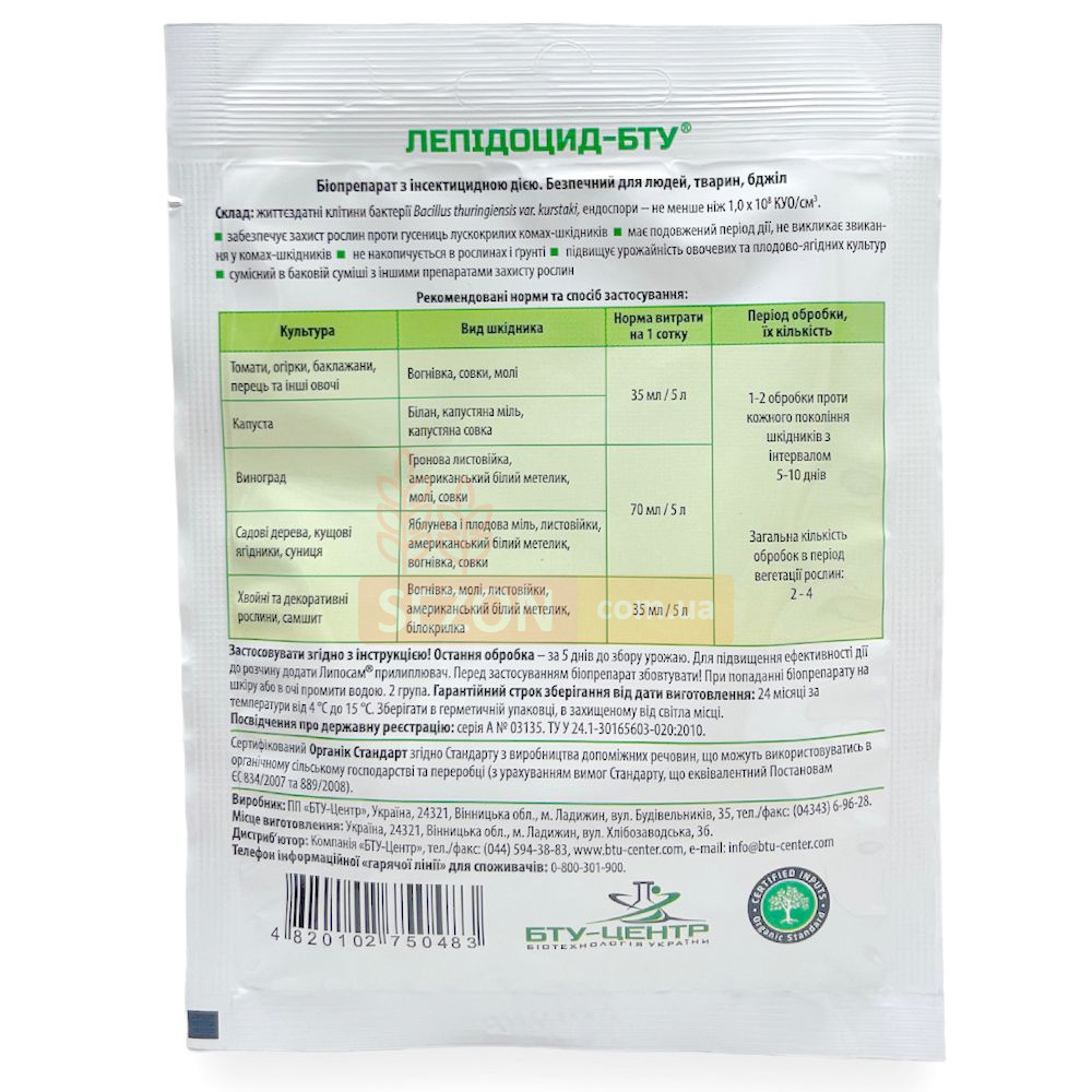 Лепідоцид — це біологічний засіб на основі культури бактерії Bacillus thuringiensis var. kurstaki. Застосовується для захисту овочевих, плодо-ягідних і декоративних культур від гусені лускокрилих комах. Підходить для використання в органічному землеробстві.