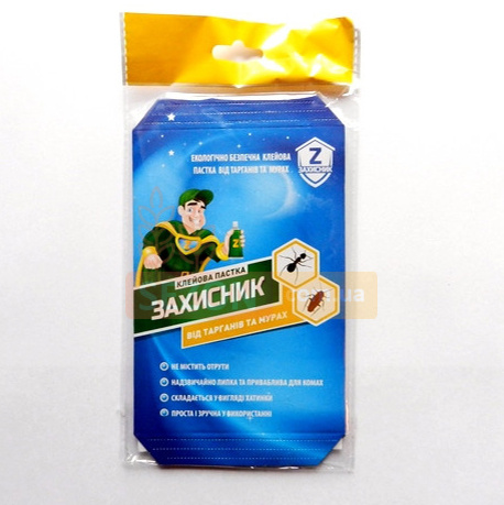 Захисник (Захисник) клейова пастка від тарганів і мурах - являє собою картонну пластину, яка складається у вигляді хатинки. На внутрішній бік пастки нанесений шар клею. Для залучення комах та заманювання їх усередину на клейовій основі є незначна кількість атрактанта. Зовнішній бік пастки має яскраве забарвлення, містить інформацію виробника щодо застосування, зберігання, утилізації. Поштучно упакована у прозору полімерну плівку.