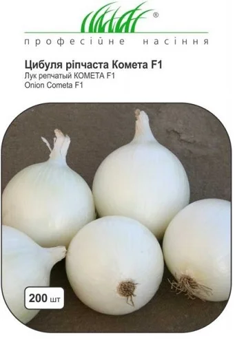 Комета F1 - гібрид білої цибулі, що володіє відмінними смаковими та салатними якостями. Рослина має гарну силу зростання та високу врожайність. Цибулини білого кольору, великі та греблі. Внутрішні луски щільні та дуже соковиті. Цибуля стійка до рожевої гнилі. Тип: ріпчастий. Період вегетації: 115–125 днів.