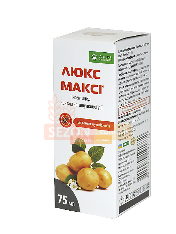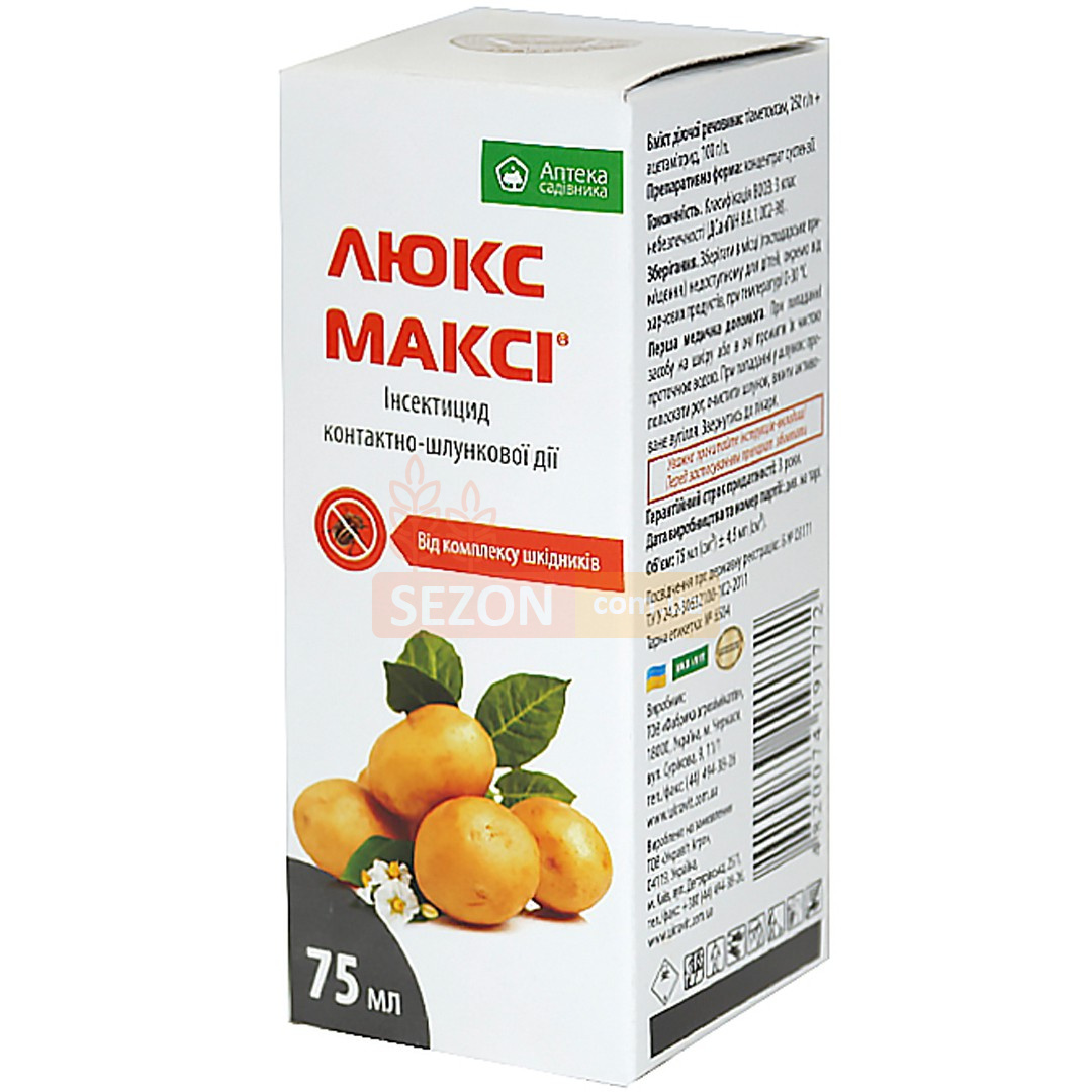 Люкс Максі 75мл. (Укравіт) – потужний інсектицид контактно-кишкової дії для застосування у плодових насадженнях, винограді, томатах, картоплі проти широкого спектру шкідників. Інсектицид контактно-шлунковий Люкс Максі 75 мл відмінно працює проти колорадського жука, личинок, попелиці 1.5 мл на 8 л води, плодожерки, молі, листовійки, пильщика 4 мл на 6 л води, від шкідників винограду 3 мл на 5 л.