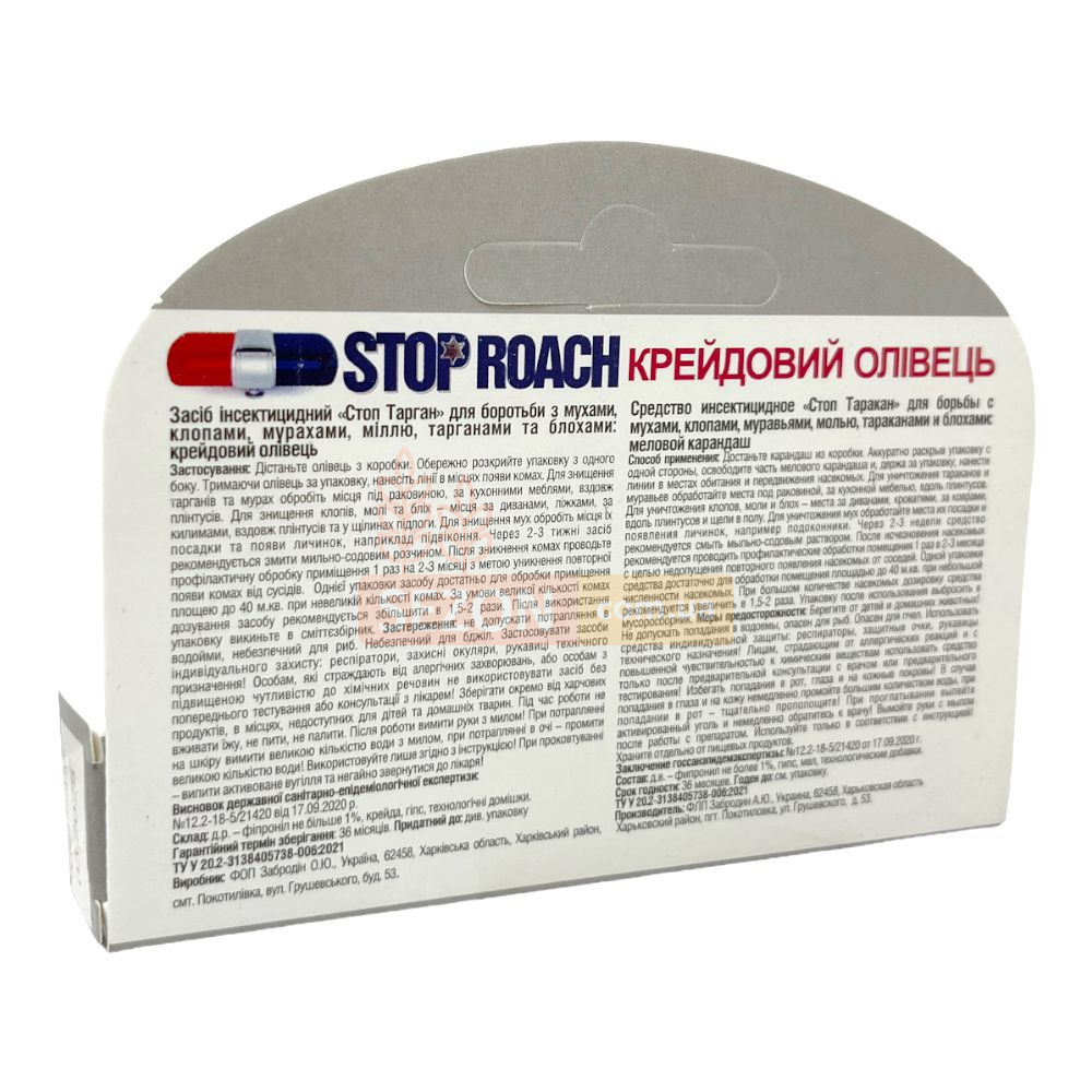 "Інсектицид у вигляді крейди Стоп Таракан, створений з використанням технологій, розроблених Корнельським університетом США, є ефективним рішенням для знищення всіх видів тарганів і мурах. Цей препарат містить фіпроніл - контактний та кишковий інсектицид, який при попаданні в організм комахи призводить до порушення функцій нервової системи, що призводить до паралічу і наступної смерті протягом кількох годин.Отруєна комаха здатна заражати своїх родичів, поширюючи отруту по всій колонії.В результаті, все населення комах зникає протягом 5-7 днів. виробничих, медичних приміщень, складів, льохів, сховищ, а також для боротьби з мухами, клопами, міллю, бліхами.
