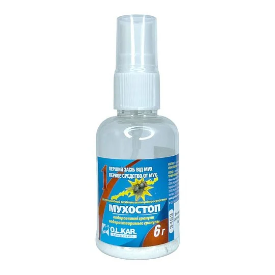 Приготування робочого розчину: в окремій тарі розчинити 400 г "Мухостоп" у 320 мл холодної води. Ретельно перемішати до одержання однорідного розчину.