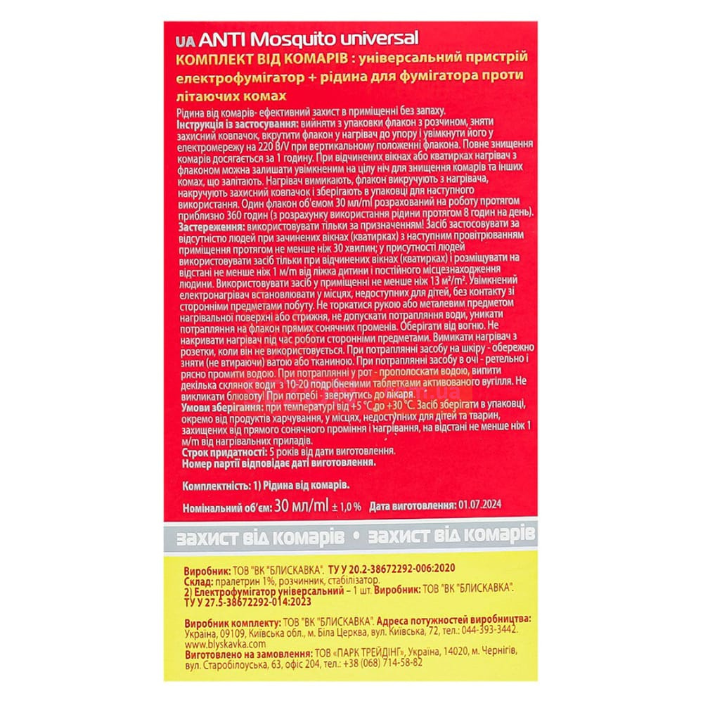 | Призначення | Захист від комарів і мошок |