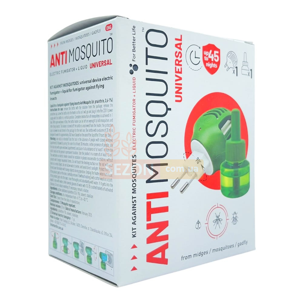 Комплект ANTImosquito — це практичний та ефективний засіб для захисту від комарів, мошок та інших літаючих комах. Він складається з електрофумігатора та змінного флакону з рідиною Некусайка об’ємом 30 мл. Одного комплекту достатньо для безперервного використання протягом 45 ночей. Це рішення для тих, хто цінує комфорт, безпеку та надійність у боротьбі з комахами.