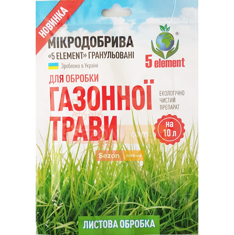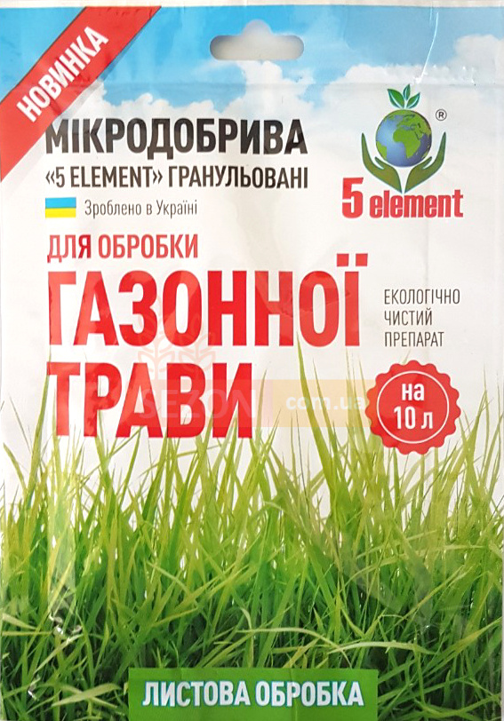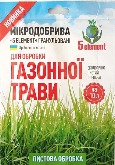"5 ELEMENT" представляет собой комплекс солей макро и микроэлементов, специально подобранный для стимулирования работы грибов-эндофитов в прикорневой зоне и непосредственно в самом растении, которые способствуют бурному развитию полезных почвенных микроорганизмов, в первую очередь – различных бактерий и ризосферных экзобактерий в частности, разрушающих сложноусвояемые соединения и превращая их в легкодоступные, тем самым обеспечивая растение всеми необходимыми физиологически активными веществами. Происходит процесс, идентичный действию при внесении в почву больших норм минеральных (от 1 до 4 ц\га) и органических (5-10 т/га) удобрений. Проводить первую обработку после появления всходов газонной травы через 7-8 дней. Вторую и третью обработку через 10-12 дней. Потом проводить обработку после каждого скашивания газонной травы.