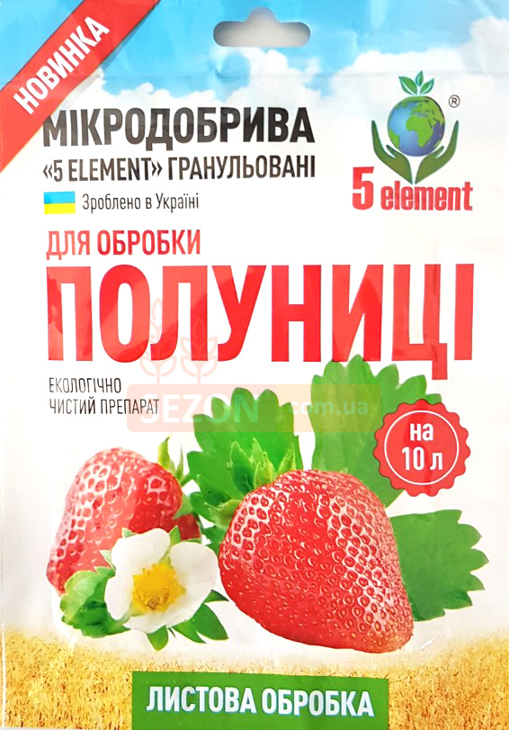 "5 ELEMENT" представляет собой комплекс солей макро и микроэлементов, специально подобранный для стимулирования работы грибов-эндофитов в прикорневой зоне и непосредственно в самом растении, которые способствуют бурному развитию полезных почвенных микроорганизмов, в первую очередь – различных бактерий и ризосферных экзобактерий в частности, разрушающих сложноусвояемые соединения и превращая их в легкодоступные, тем самым обеспечивая растение всеми необходимыми физиологически активными веществами. Происходит процесс, идентичный действию при внесении в почву больших норм минеральных (от 1 до 4 ц\га) и органических (5-10 т/га) удобрений. Фаза обработки : первая - восстановление вегетации; вторая - через 10-12 дней; третья - перед цветением; четвертая - после цветения; пятая - начало созревания.