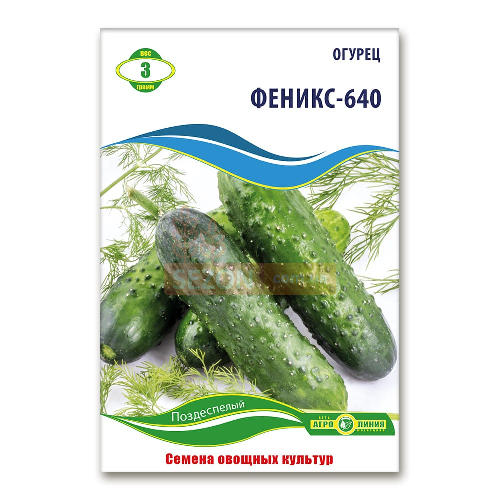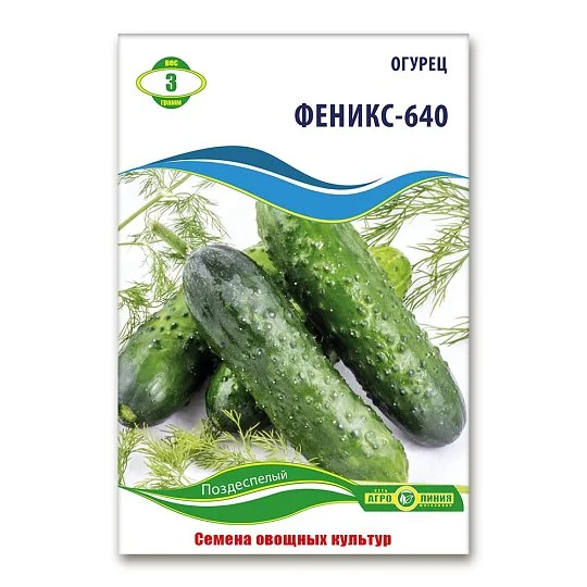 "Фенікс 640" – це пізньостиглий сорт огірків, призначений для вирощування у відкритому ґрунті. Термін дозрівання плодів становить 55-65 днів з моменту появи сходів. Огірки мають крупнобугорчасту поверхню, білі шипи, довжину 12-16 см і вагу 120-180 г. Вони зберігають насичений зелений колір і не жовтіють навіть при тривалому зберіганні. Основне плодоношення припадає на бічні пагони і триває до настання перших заморозків. Сорт стійкий до несправжньої борошнистої роси, що робить його чудовим вибором для стабільного врожаю.