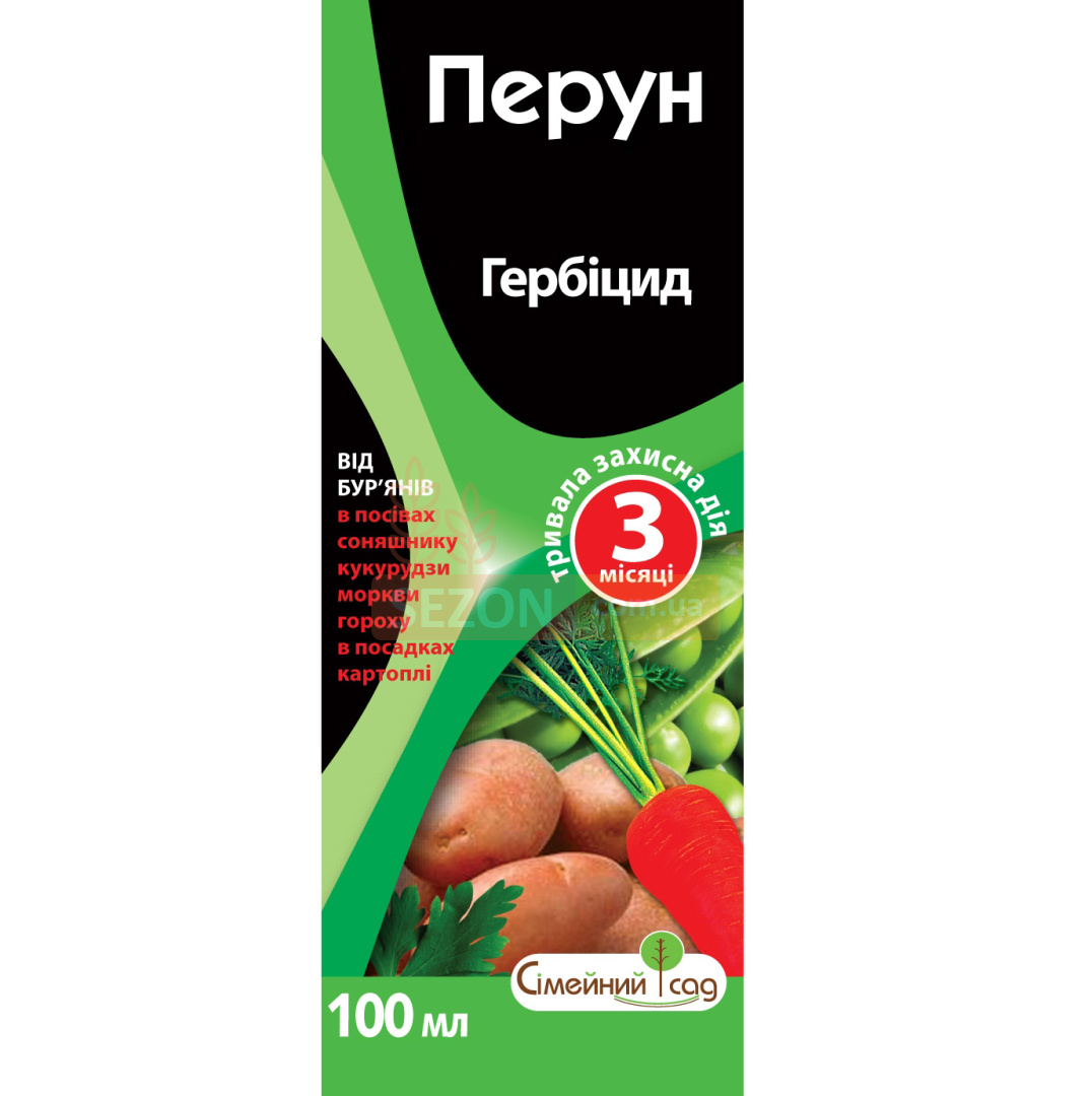 "Перун" - системний гербіцидний засіб виборчої дії. Вражає однорічні дводольні та злакові бур'яни. Використовується на посівах сої, кукурудзи, соняшнику, моркви, гороху, посадках картоплі. До препарату «Перун» чутливі гірчак, зірок, дурман, тонконіг, осот, пасльон, росичка, кропива, просо, перчатка та ін. Активна речовина — прометрин. Він проникає в рослину через надземні органи, поширюючись судинами, блокує процес фотосинтезу, який є життєво важливим для рослини. Вже пророслі бур'яни відмирають протягом 5-7 днів, а молоді гинуть під час проростання.