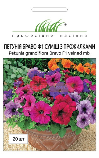 Петунія грандіфлора Браво F1, суміш із прожилками (Petunia grandiflora Bravo F1) – одна з найбільш ранньоквітучих серед петуній. Квіти великі, білого забарвлення, 8-10 см у діаметрі. Серія Браво найбільш однорідна за часом цвітіння. Рослина нечутлива до довжини світлового дня. Чудово виглядає при оформленні клумб, рабаток, також на балконах і в горщиках.