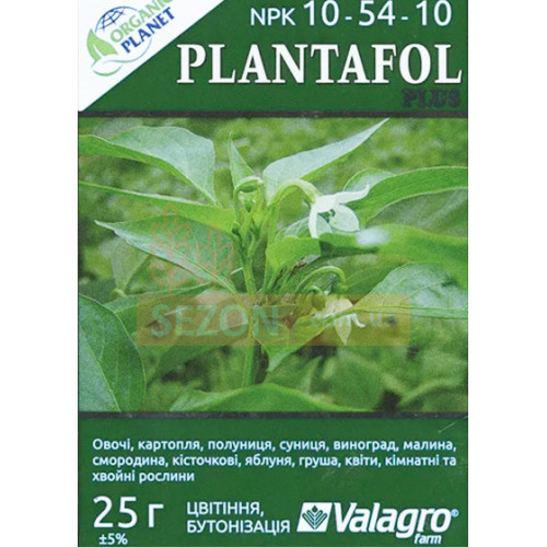 Плантафол відноситься до високо хімічно чистих і повністю розчинних добрив, спеціально розроблених для листового підживлення рослин. У складі добрива є азот, фосфор, калій + мікроелементи в хелатній формі. Високий вміст фосфору стимулює процеси формування генеративних органів, цвітіння та зав'язі плода. Плантафол застосовується в початкові фази росту, до і під час цвітіння, а також у випадках, коли необхідно призупинити вегетативний розвиток. Добриво може бути доповненням до прикореневих підживлень у критичні періоди (заморожування, перезволоження грунту, посуха, критично високі температури повітря).