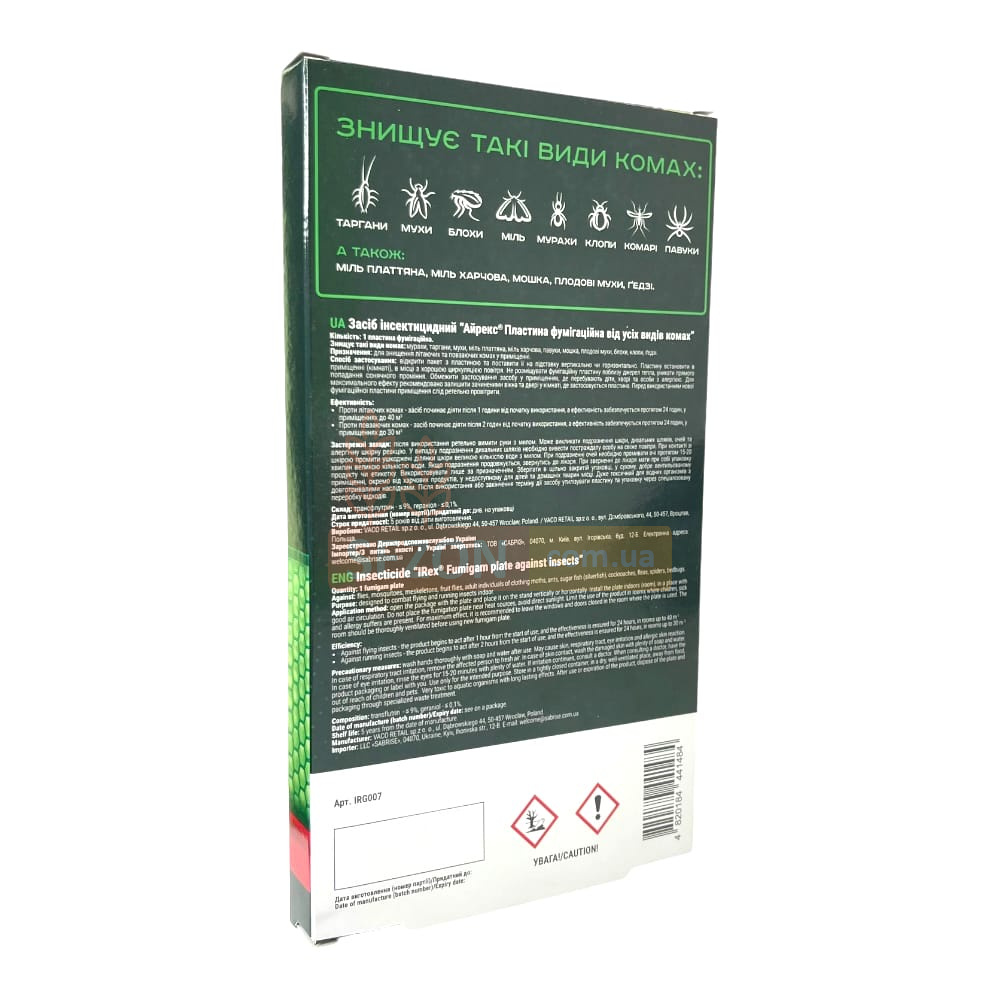Фумігаційна пластина IREX — це сучасне рішення для захисту вашого дому, дачі чи господарського приміщення від усіх видів літаючих і повзучих комах. Завдяки унікальній технології, активні речовини, просочені в пластину, починають діяти відразу після розкриття упаковки, рівномірно розповсюджуючись у повітрі та створюючи безпечну, але ефективну концентрацію.