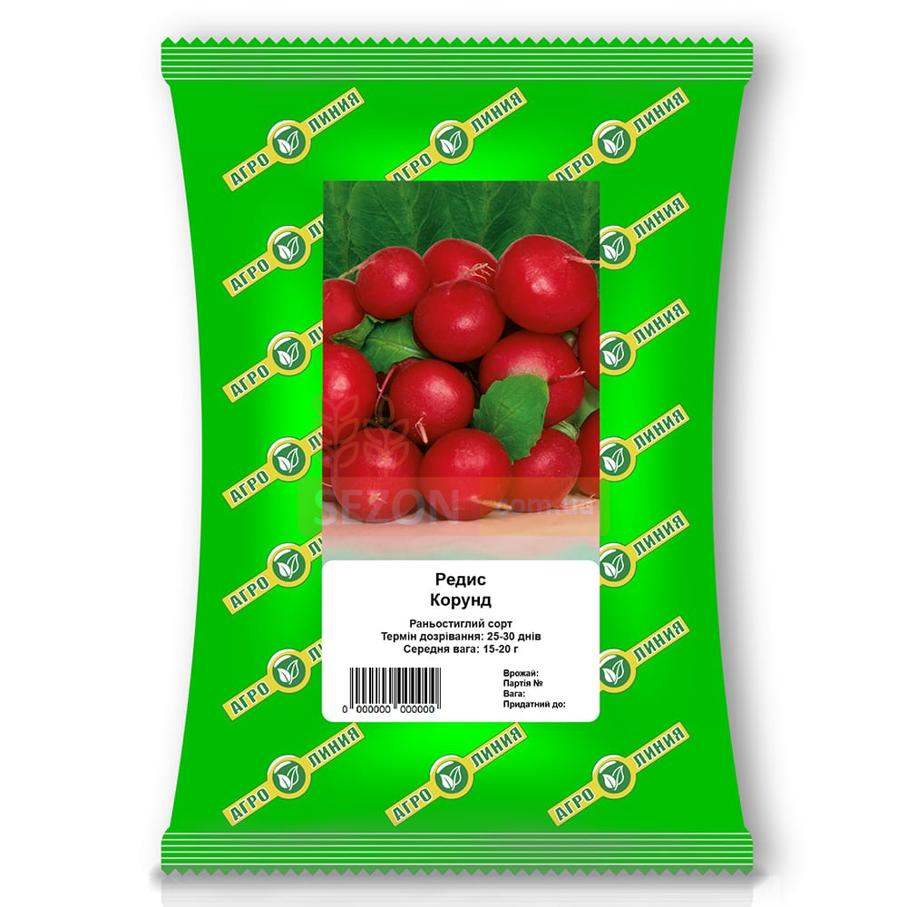 Редис «Корунд» — це один із найкращих ранньостиглих сортів, який тішить своїми результатами вже через 25–30 днів після посіву. Рослина має прямостояче зелене бадилля та красиві округлі коренеплоди насичено-червоного кольору вагою 15–20 грамів. Усередині редис має ніжну білосніжну м’якоть із солодкуватим смаком.