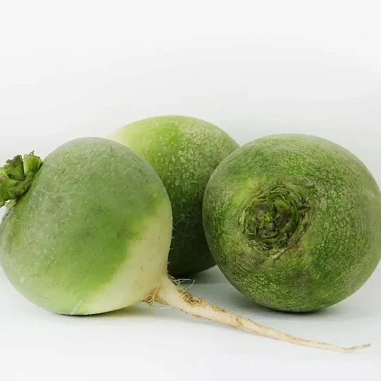 Редька Маргеланська зимова (зелена) – це середньоранній сорт, який дозріває за 65–80 днів. Коренеплоди відрізняються великими розмірами, гладкою поверхнею та темно-зеленим забарвленням із білим кінчиком. Діаметр плодів досягає 6–9 см, а вага варіюється від 210 до 480 г. Коренеплоди на 2/3 занурені в ґрунт, що полегшує їх збір.