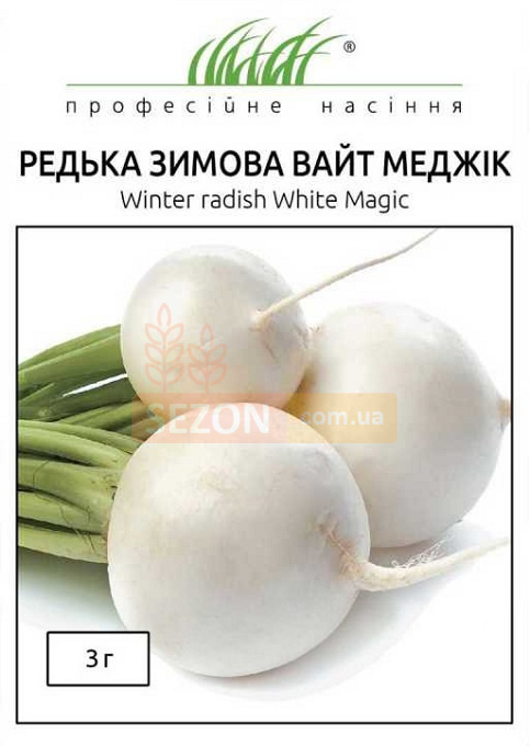 Ранньостиглий сорт зимової редьки. Коренеплоди редьки Уайт меджик легко вириваються з ґрунту, мають соковиту, білу м'якоть зі слабогострим смаком. Термін вегетації: 50-60 днів. Маса плода: 200-300 г.