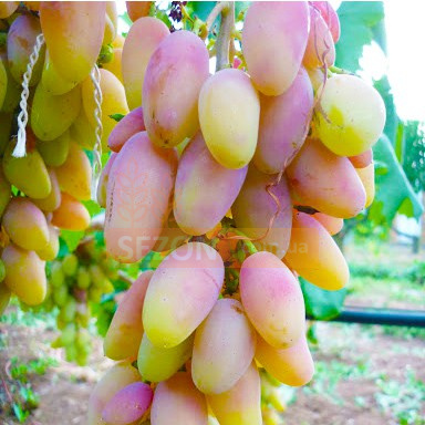 Грозди формируются крупные и привлекательные, с равномерно окрашенными ягодами. Бело-розовый оттенок придаёт им особую декоративность. Мякоть плотная, мясисто-сочная, кожица съедаемая. Вкус гармоничный, с приятным послевкусием.