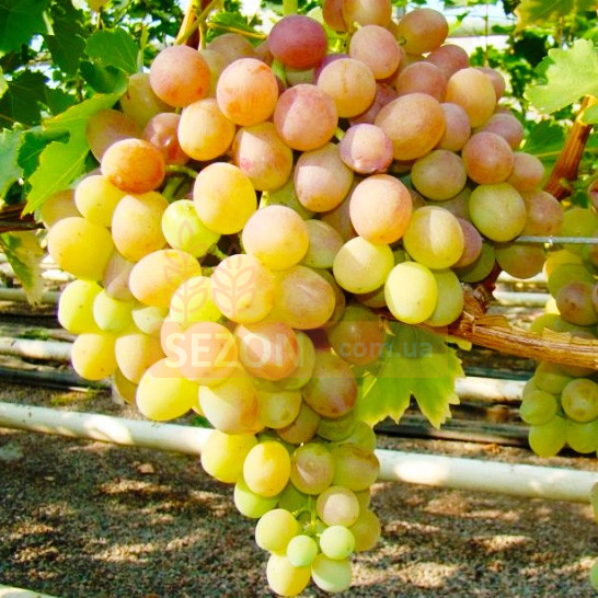 Кусты выше средней силы роста, хорошо развиваются при правильной агротехнике. Грозди цилиндрической формы, массой 500–800 г, их плотность зависит от качества опыления. Ягоды крупные, овальные, средним весом 9,8 г. Окраска непостоянна — от бледно-розовой до ярко-розовой, в зависимости от условий выращивания и степени освещённости. Мякоть мясистая, кожица тонкая, вкус сбалансированный, гармоничный.