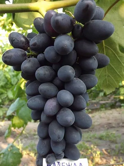 Грозди крупные, массой до 1400 г. Ягоды овальные, вытянутые, тёмно-синие с характерным белым налётом, массой около 14 г и размером 32×24 мм. Мякоть мясисто-сочная, вкус гармоничный и сортовой, оценен виноградарями как один из наиболее приятных в этой категории.