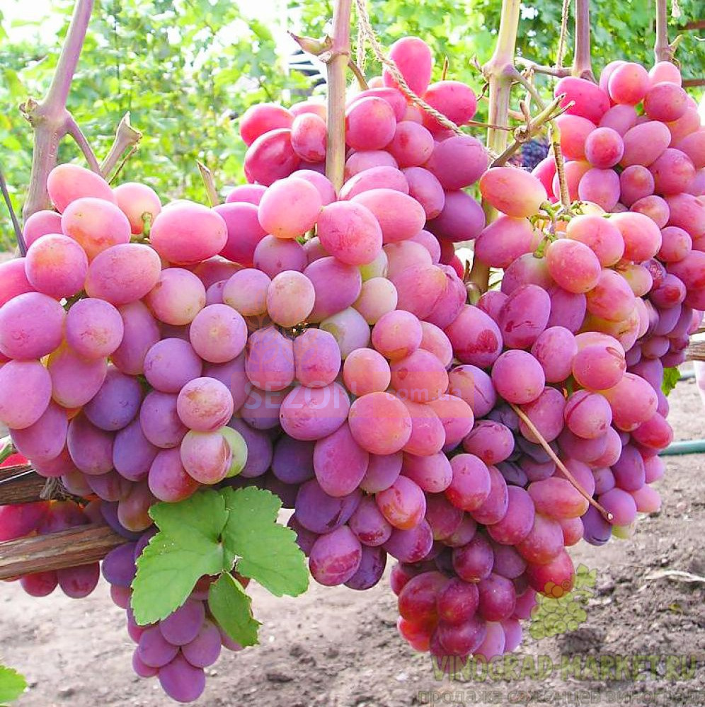 Грозди средней плотности, массой 500–700 г. Ягоды овальной формы, мясисто-сочные, кожица средней толщины, не ощущается при еде. Вкус сортовой, гармоничный, приятный. Окраска ягод зависит от освещённости: при хорошем доступе солнца они приобретают более насыщенный розовый цвет.