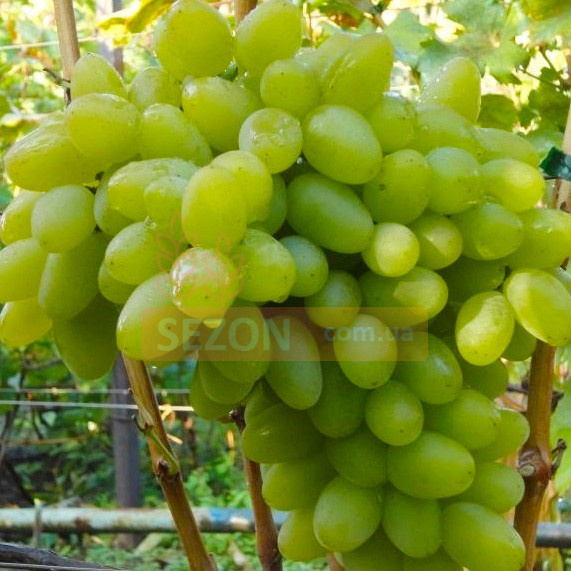 Грозди длинные, с крупными ягодами сосковидной формы размером 36×24 мм. Цвет ягод — светло-розовый, окраска становится более насыщенной при достаточном солнечном освещении. Мякоть мясистая, сочная, с ярким ароматом. Побеги вызревают рано, что способствует стабильному плодоношению. Урожай долго сохраняет товарные качества прямо на кустах.