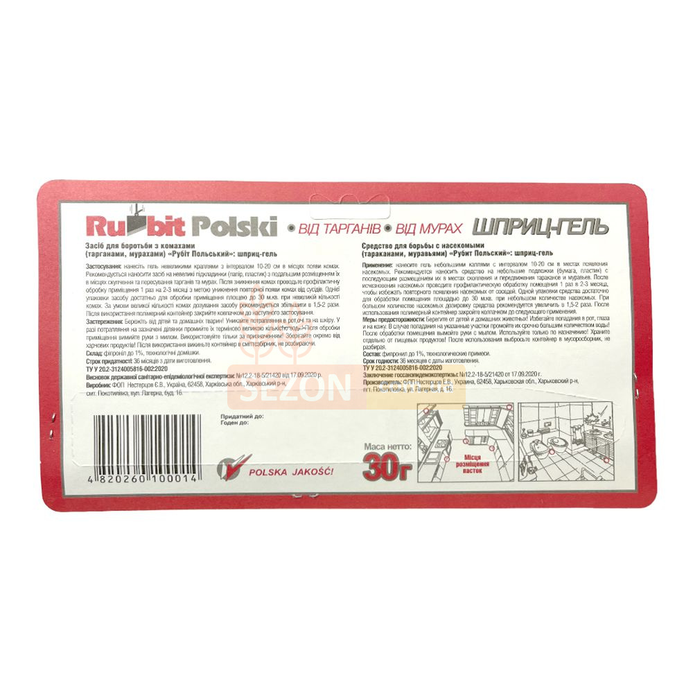 Інсектицидний гель "Rubit Polski" підходить для обробки житлових, виробничих, складських приміщень і медичних установ. Зручний шприц-дозатор дозволяє легко наносити засіб у важкодоступні місця. "Rubit Polski" не залишає слідів, є безпечним для людей і домашніх тварин, а також має економічний витратний показник. Для надійного захисту рекомендується повторна обробка кожні 2-3 місяці, що запобігає повторному появленню комах.