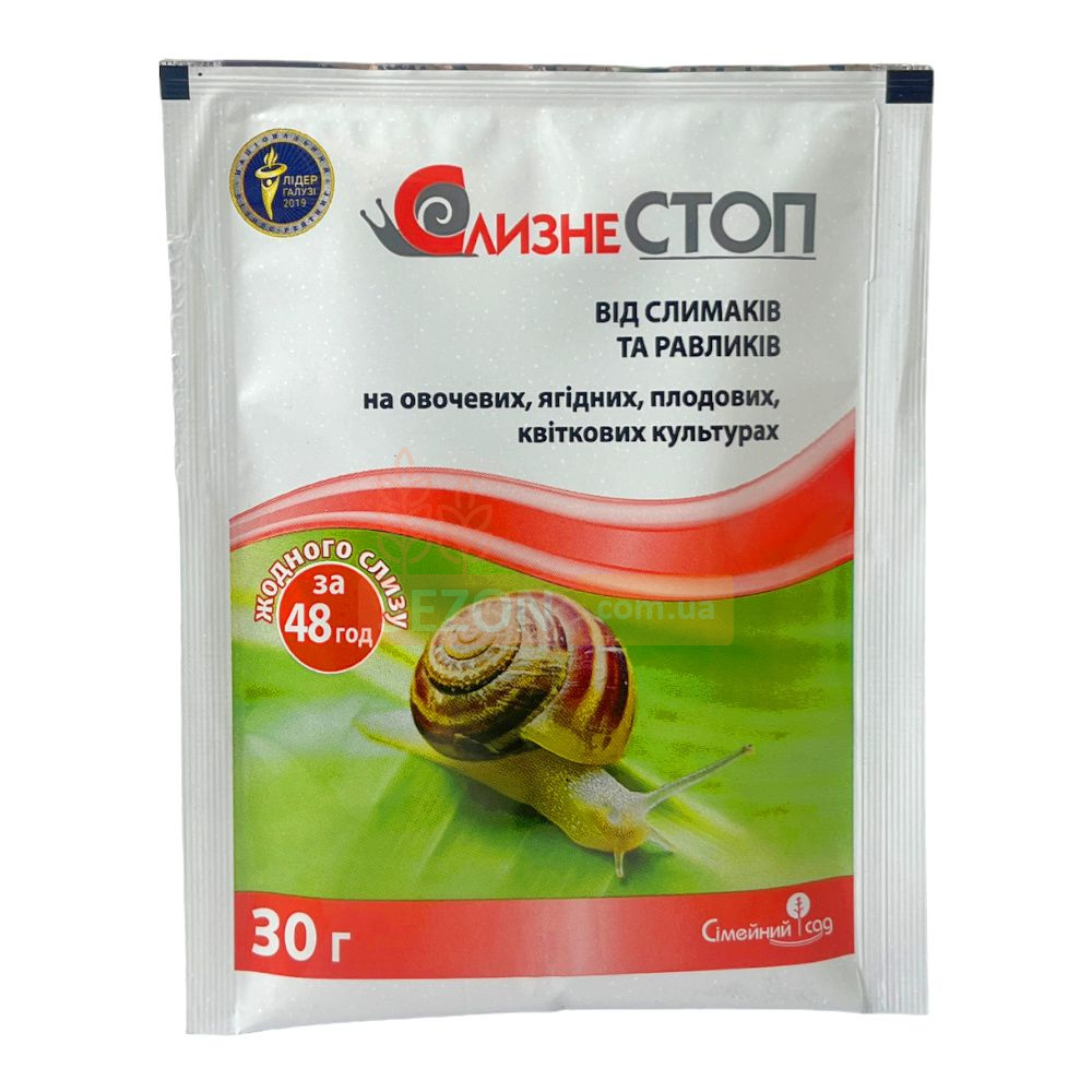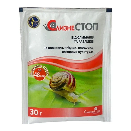 «Слизнестоп» - надійний засіб для контролю равликів та слимаків. Рекомендовано для захисту виноградників, а також ягідних, плодових, овочевих культур та квітів від цих шкідників. Фітотоксичність не має. В основу складу входить метальдегід (60 г/кг). Також містить добавки, що приманюють, які привертають молюсків. Відрізняється контактним та шлунковим впливом на шкідників. Від безпосереднього контакту з гранулами препарату вони виділяють величезну кількість слизу, перестають рухатись і через 2 доби висихають. Те саме відбувається при попаданні засобу через їх шлунок. Гранули водонепроникні, тому не втрачають своєї ефективності навіть тривалий час.