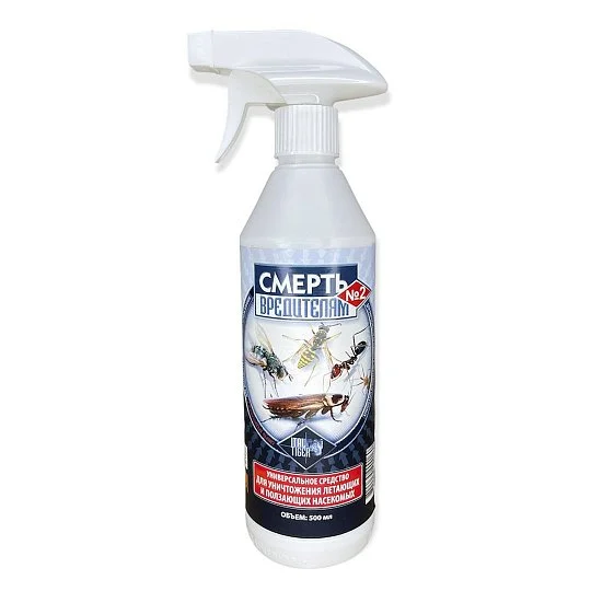 Інсектицидний засіб "Смерть шкідникам № 2" призначений для усунення всіх крилатих та повзучих комах, що населяють простори всередині та поза приміщеннями. Продукт містить ефір ефенпроксу, тетраметрин та піперонілбутоксид. Комахи сходять зі сцени життя протягом однієї доби після обробки спреєм. Спрей "Смерть шкідникам" не має неприємного аромату, не шкодить озоновому шару та є екологічно безпечним. Засіб "Смерть шкідникам № 2" успішно застосовується проти мух, оводів, кліщів, клопів, шкіроїдів, мошок, комарів, москітів, прусаків, тарганів, ос, шершнів та інших комах. Крім того, завдяки активному компоненту, цей інсектицидний спрей дуже впливає на тропічних москітів.