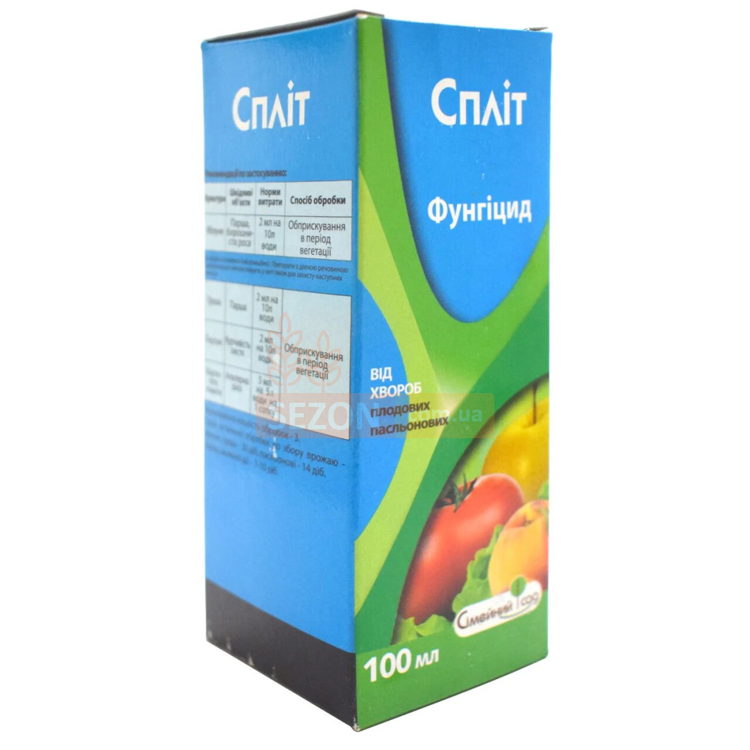 Спліт – вільний препарат для комплексного захисту рослин від яблучної парші, захворювань груші, персика, томату та картоплі. Швидко проникає в рослину та не змивається дощем вже через 2 години! Після застосування. Захищає упродовж 10 днів. Безпечний для бджіл. Також використовується на кольорах.