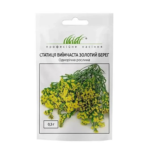 Статиця виїмчаста Золотий берег (Limonium sinuatum Gold Coast) — однорічна рослина з яскравими, золотисто-жовтими квітками, ідеально підходить як для прикраси клумб, так і для створення сухих букетів. Культура досягає у висоту 60–70 см, має прямостоячі стебла, розгалужені у верхній частині, та компактні суцвіття діаметром до 1 см.